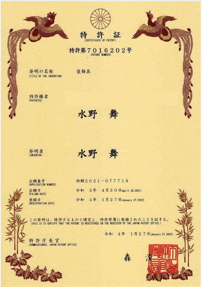 ・マイヤリング®の国内特許取得(特許第7016202号)